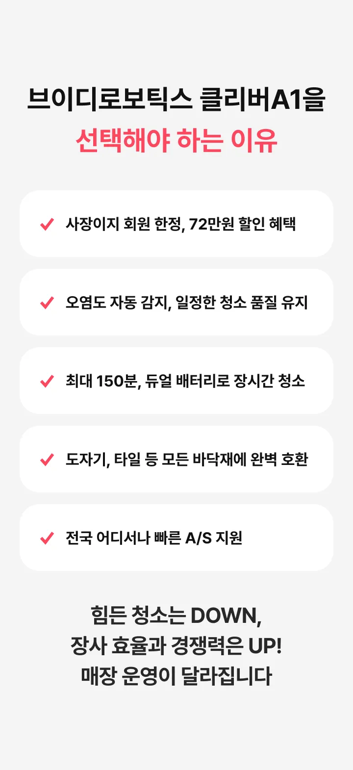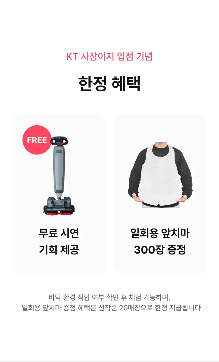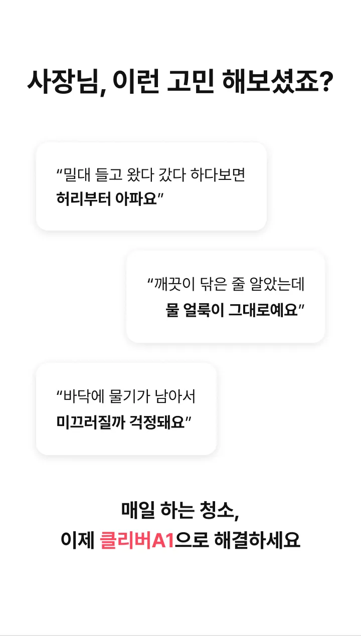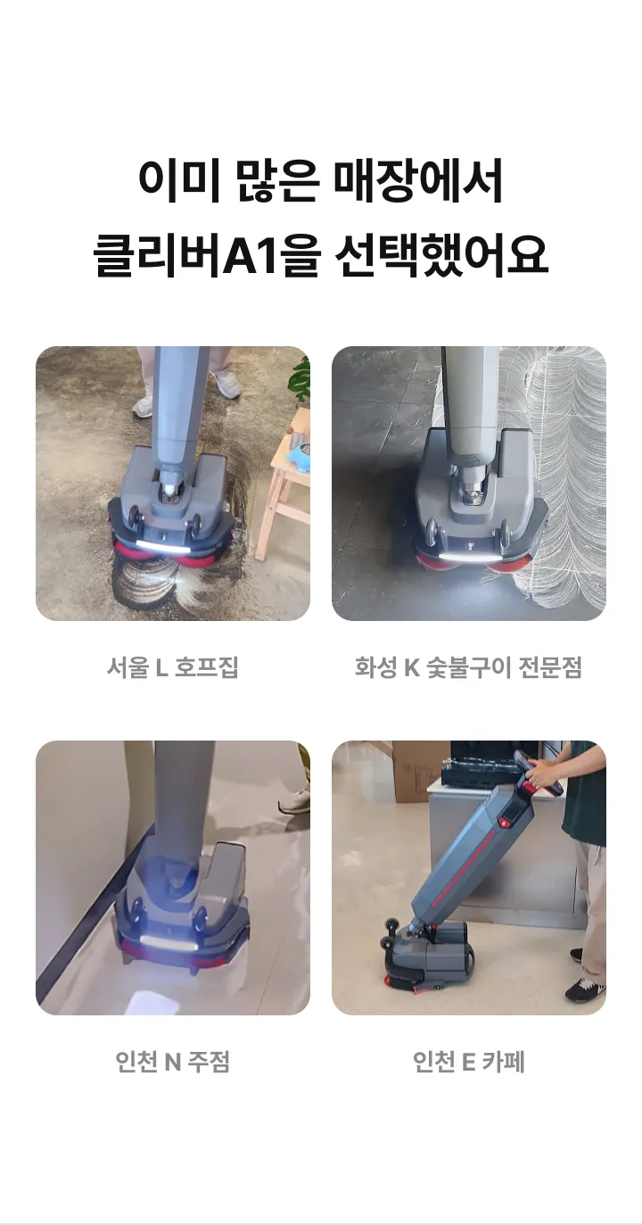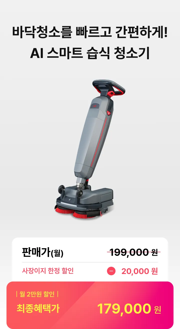 스크러버 클리버A1 판매가(월) 199,000원 특별할인 -20,000원 최종혜택가 179,000원 상담 신청 시 전문 컨설턴트가 매장 환경에 맞는 최적의 제품과 사용 방법을 안내해 드립니다 해당 가격은 36개월 기준, 소유형 분납 방식의 월 납부 금액입니다. (부가세 별도)