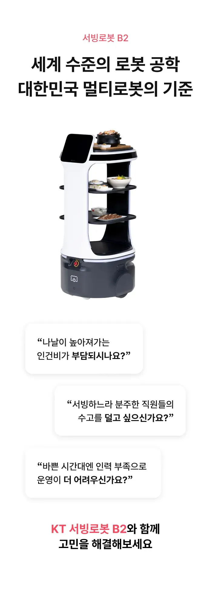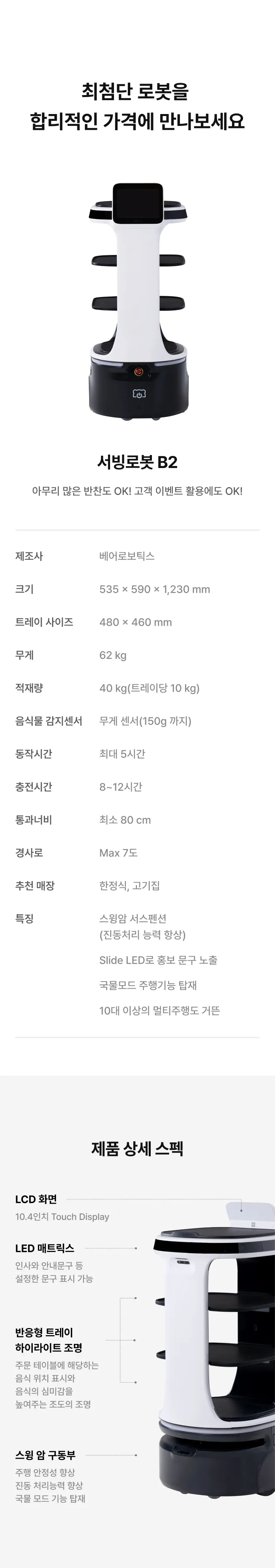 서빙 로봇 서빙로봇 B2 가격 상담 후 안내 제품 금액은 설치 환경, 제품 선택 옵션에 따라 다를 수 있어요 구매상담을 통해 전문 상담원이 고객님의 상품 가입을 쉽고 빠르게 도와드려요
