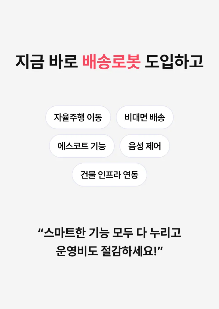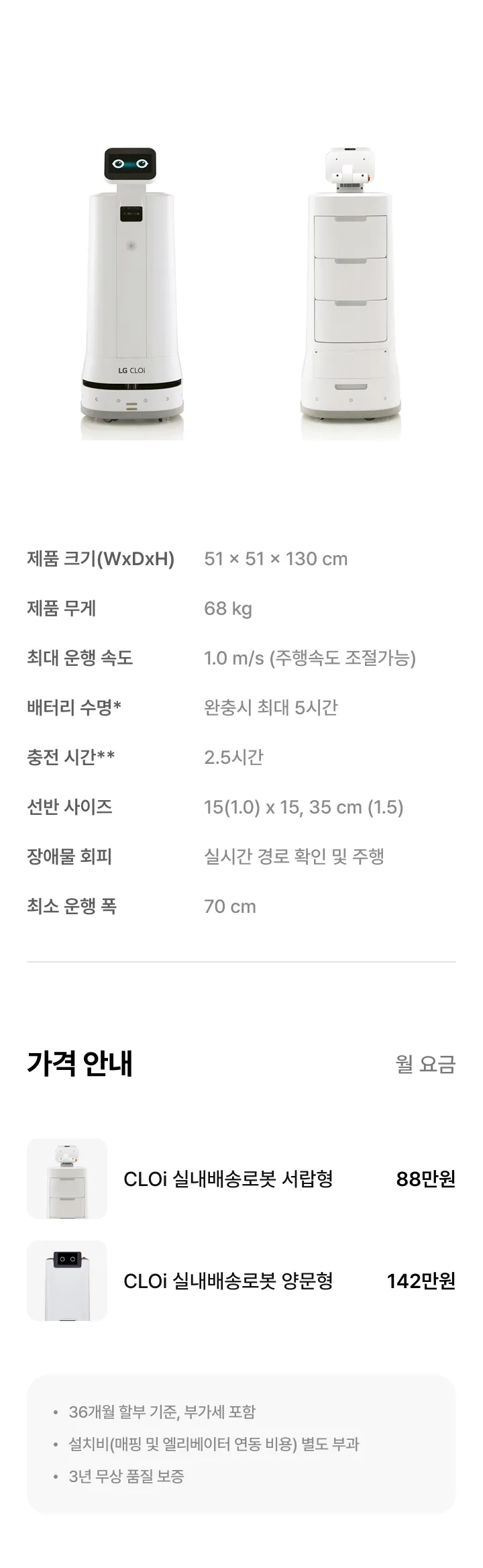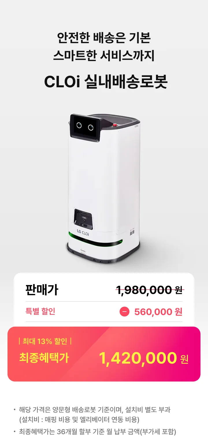 배송로봇 CLOi 실내배송로봇 가격 상담 후 안내 제품 금액은 설치 환경, 제품 선택 옵션에 따라 다를 수 있어요 구매상담을 통해 전문 상담원이 고객님의 상품 가입을 쉽고 빠르게 도와드려요