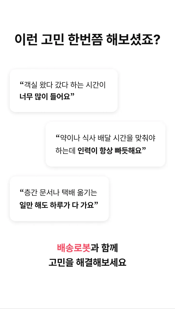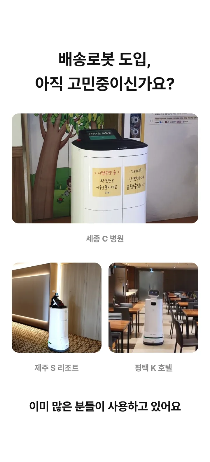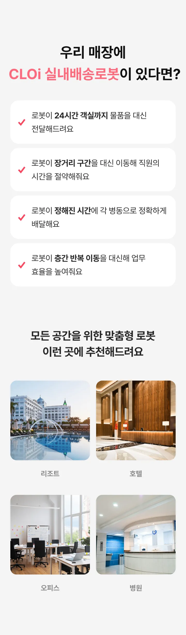 배송로봇 CLOi 실내배송로봇 가격 상담 후 안내 제품 금액은 설치 환경, 제품 선택 옵션에 따라 다를 수 있어요 구매상담을 통해 전문 상담원이 고객님의 상품 가입을 쉽고 빠르게 도와드려요