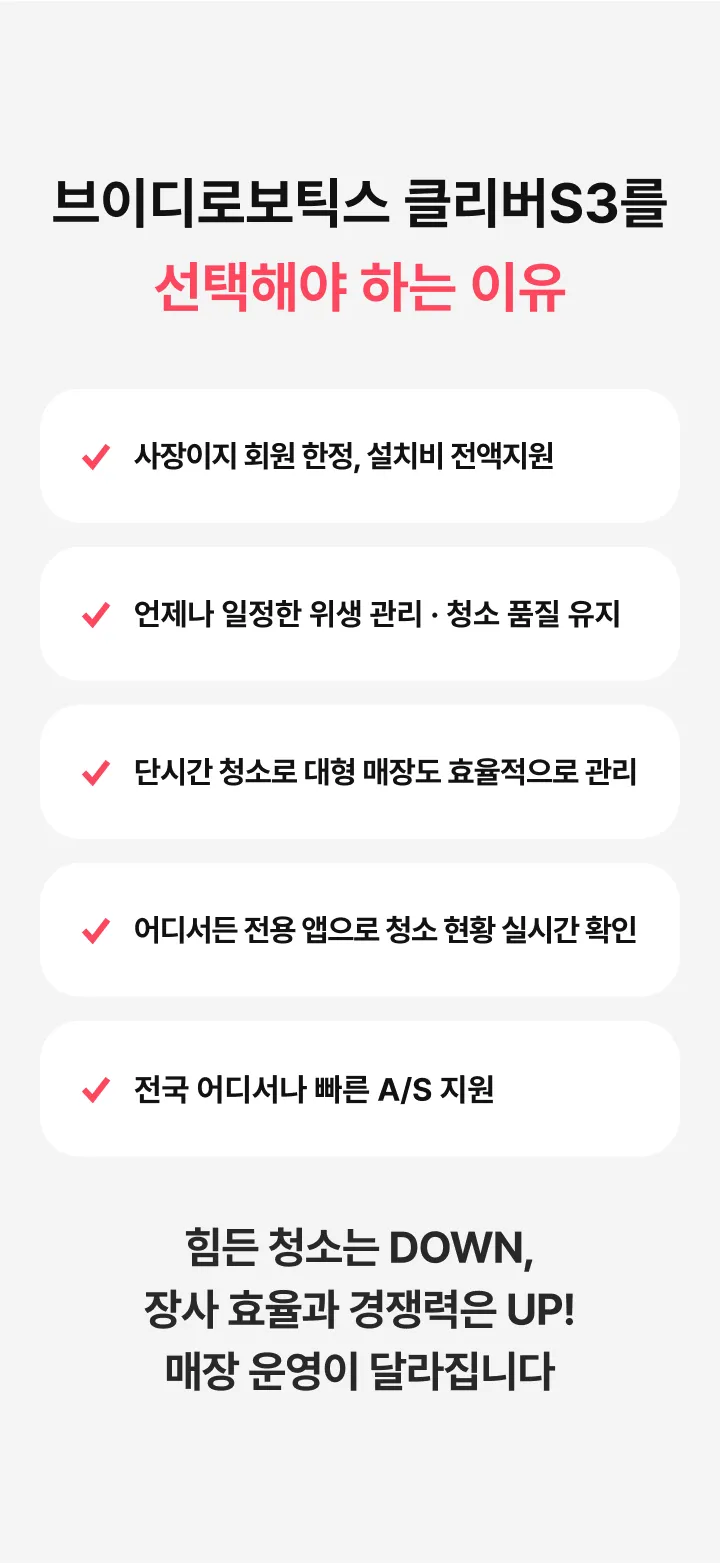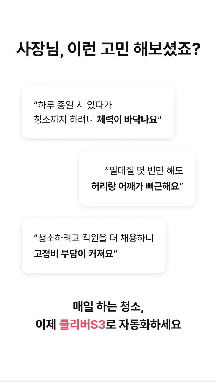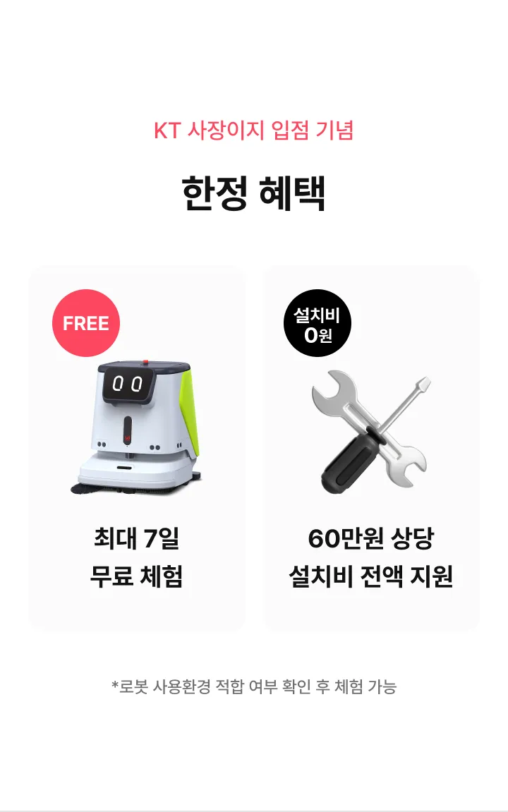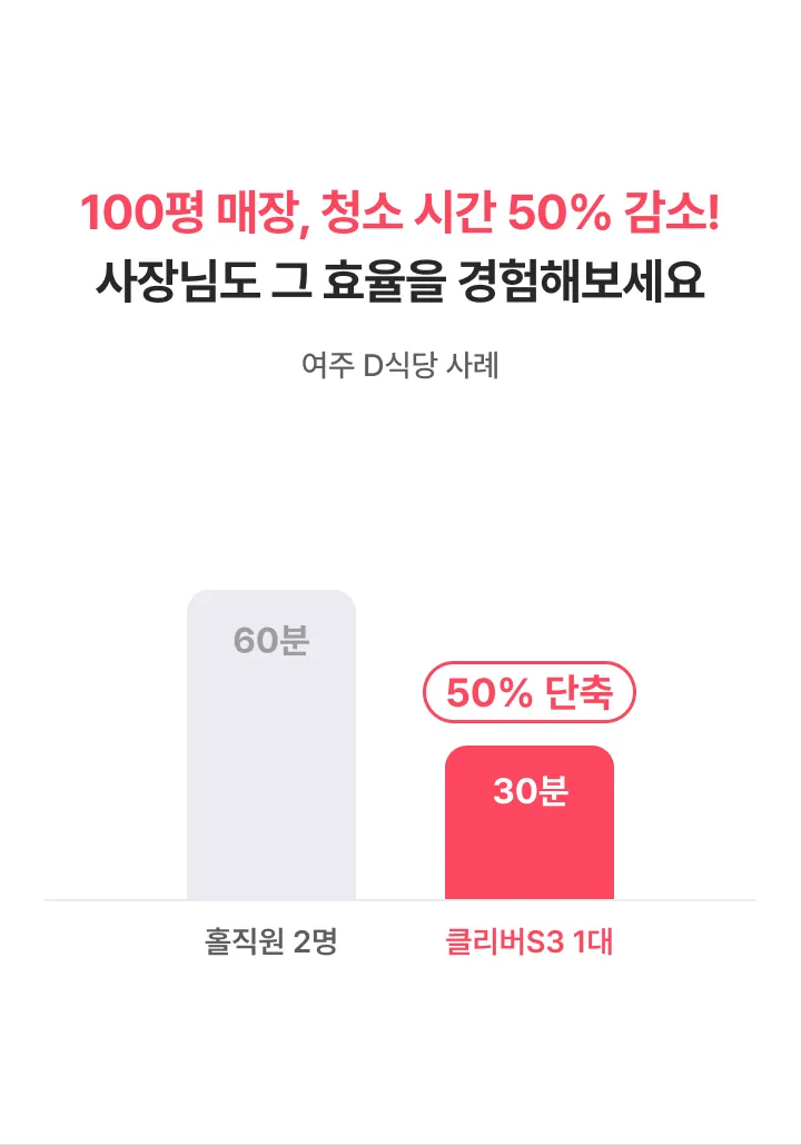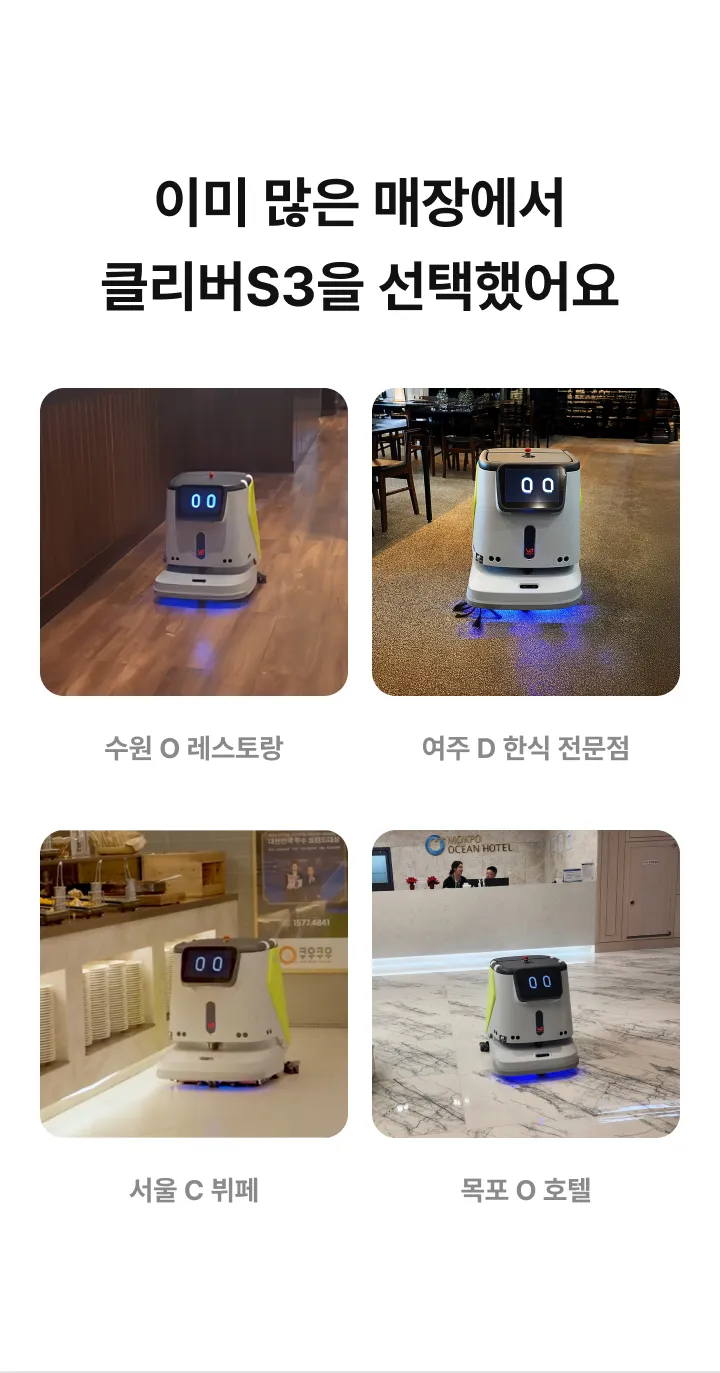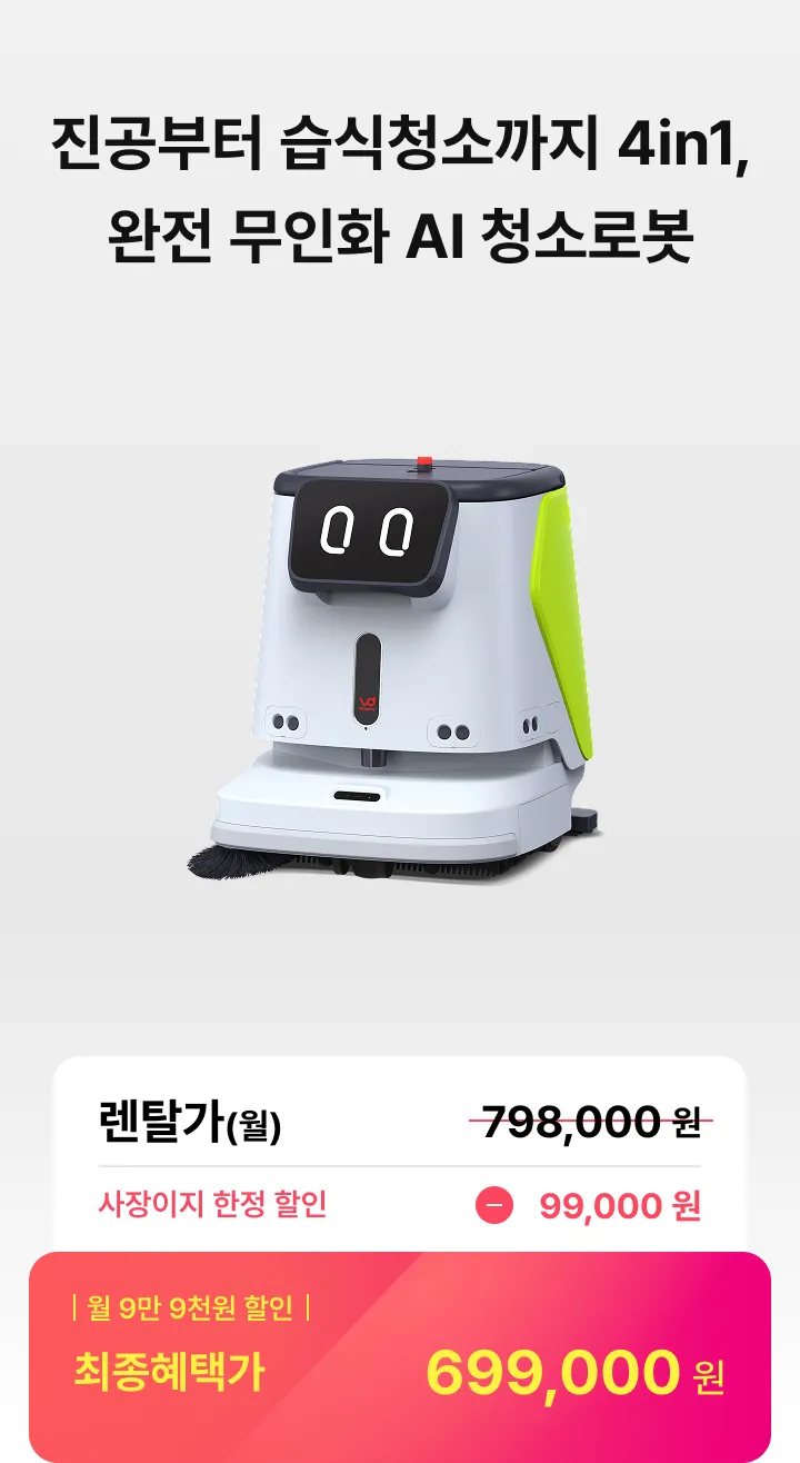 청소로봇 클리버S3 렌탈가(월) 798,000원 특별할인 -99,000원 최종혜택가 699,000원 상담 신청 시 전문 컨설턴트가 매장 환경에 맞는 최적의 제품과 사용 방법을 안내해 드립니다 해당 가격은 36개월 기준, 반납형 렌탈 기준의 월 납부 금액입니다. (부가세 별도)