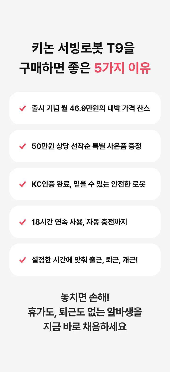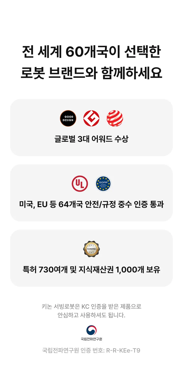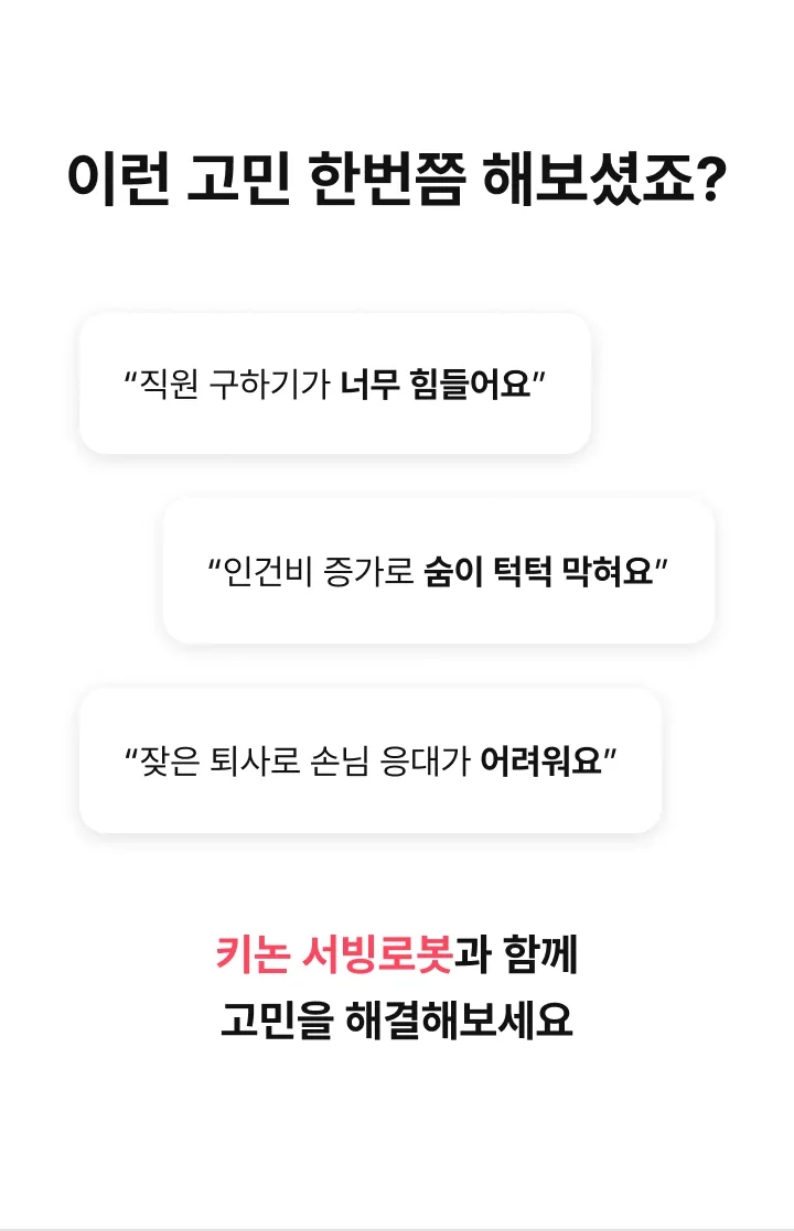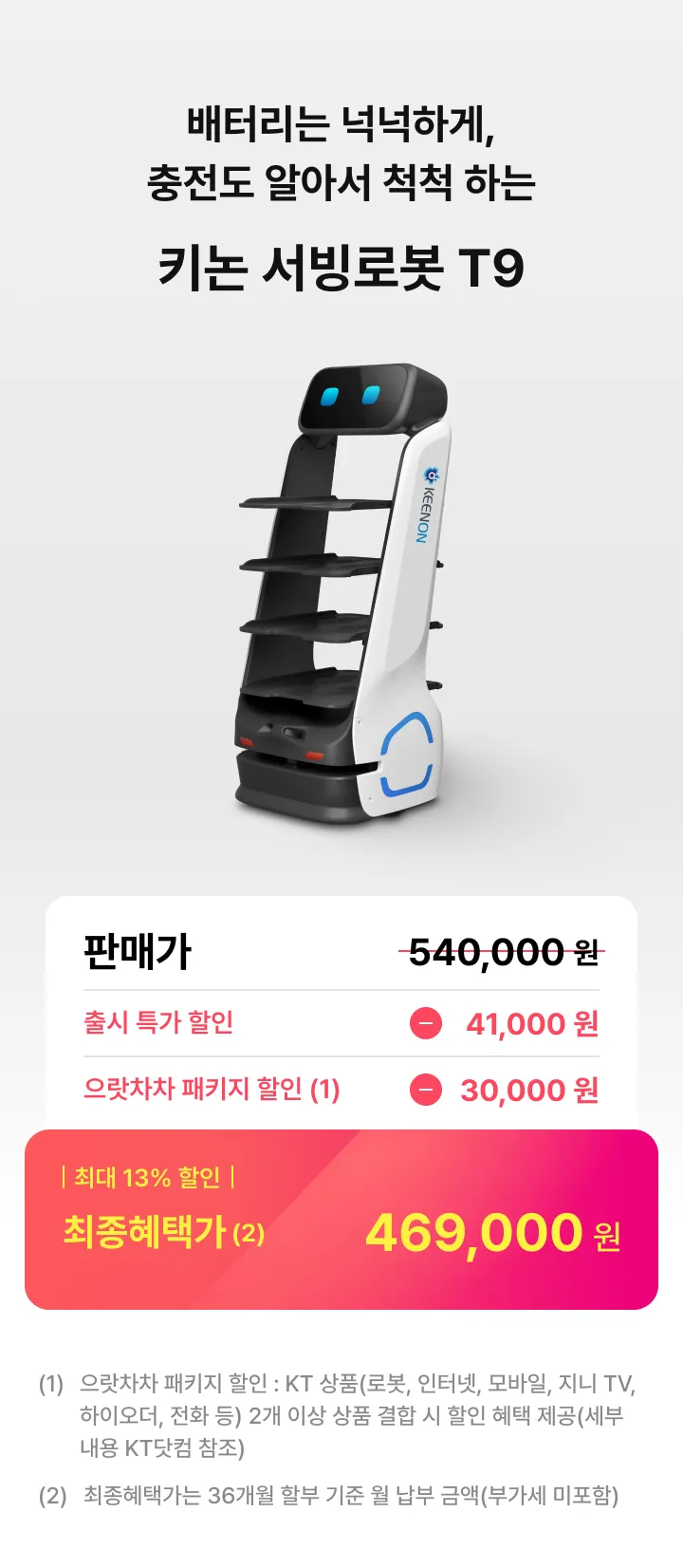서빙 로봇 키논 서빙로봇 T9 가격 상담 후 안내 제품 금액은 설치 환경, 제품 선택 옵션에 따라 다를 수 있어요 구매상담을 통해 전문 상담원이 고객님의 상품 가입을 쉽고 빠르게 도와드려요